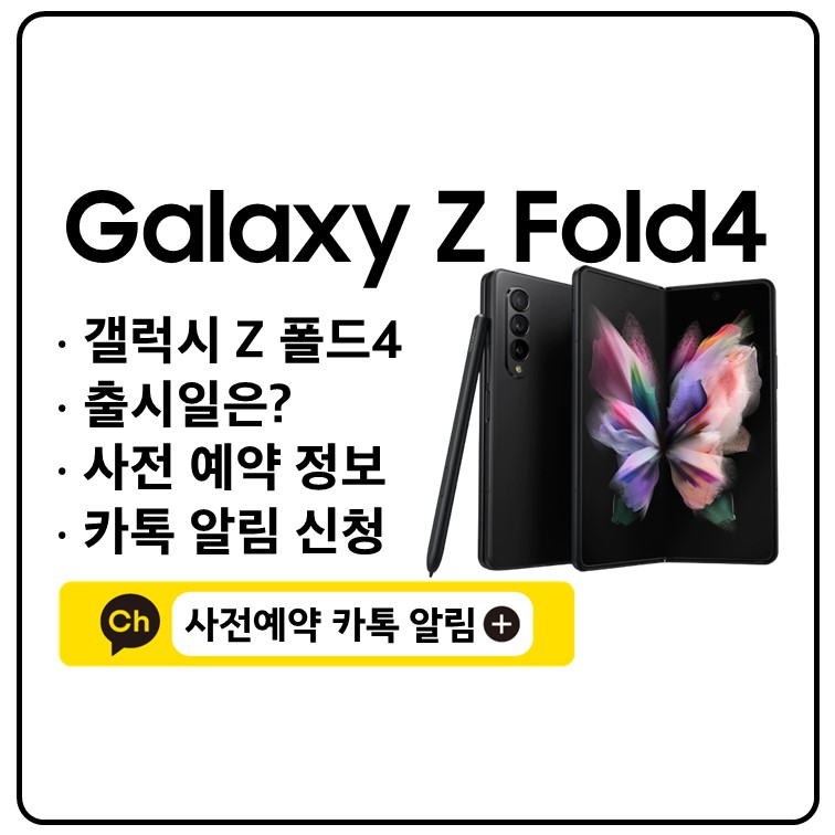 갤럭시 Z 폴드4 사전예약이 8월 16일(화)에 시작되며, 공개된 사양, 쿠팡 구매 성공방법 등의 내용을 자세히 확인할 수 있으며 이 모든 정보 구독을 위한 카톡 알림 신청을 할 수 있다.